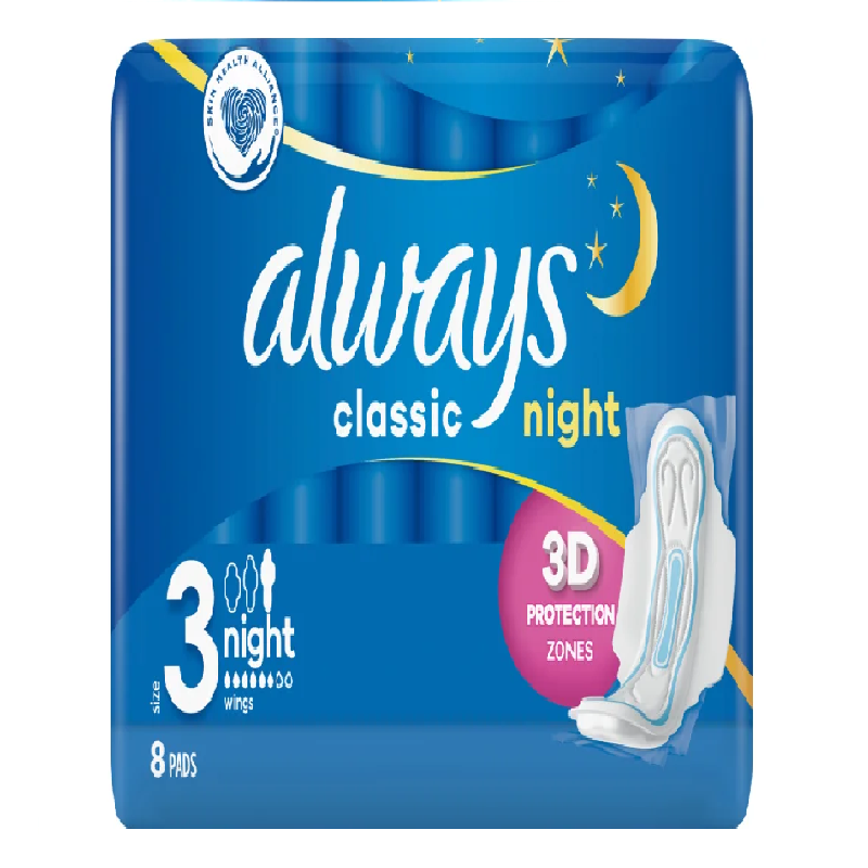 Almohadillas Sanitarias Always Classic Night. Con una absorción confiable y una forma contorneada, estas almohadillas son ideales para acompañarte en tu día a día.