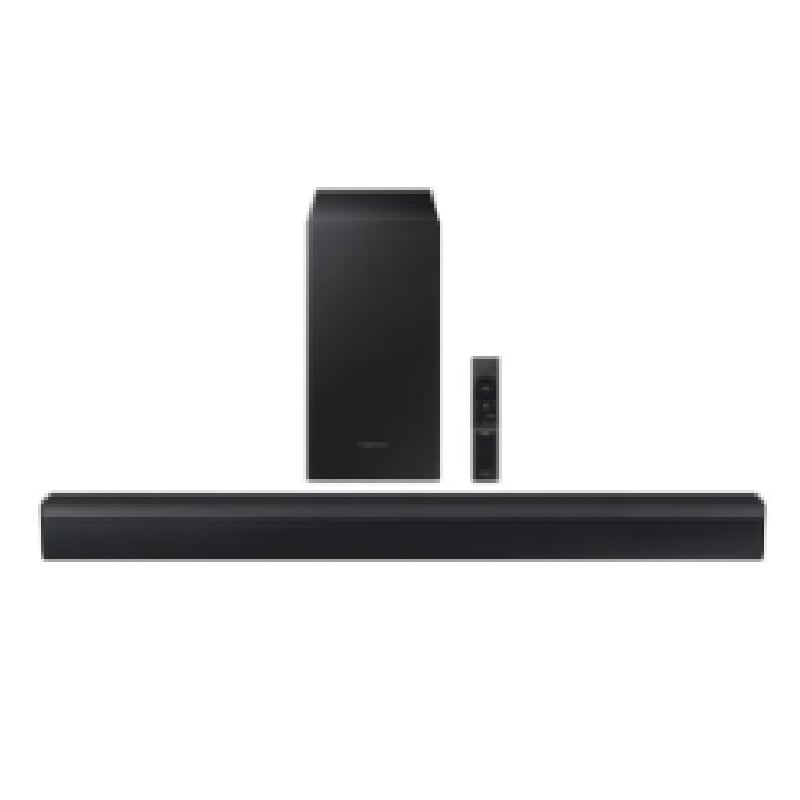 Experimente un sonido 3D espacioso con el sistema de barra de sonido HW-C450 de 2.1 canales DTS Virtual:X de Samsung. La barra de sonido está equipada con Dolby Digital y DTS Virtual:X para que disfrute de efectos de sonido 3D, mientras que el subwoofer inalámbrico incluido ofrece graves que puede potenciar con un toque en el control remoto. Adaptive Sound Lite de Samsung permite que las voces se escuchen con claridad, y el Modo Juego optimiza los juegos con audio direccional sincronizado. Controle cómodamente la barra de sonido y su televisor Samsung con el control remoto incluido. Además, puede conectar el sistema a cualquier dispositivo Bluetooth compatible, como un smartphone o un Smart TV, para reproducir audio de forma inalámbrica.