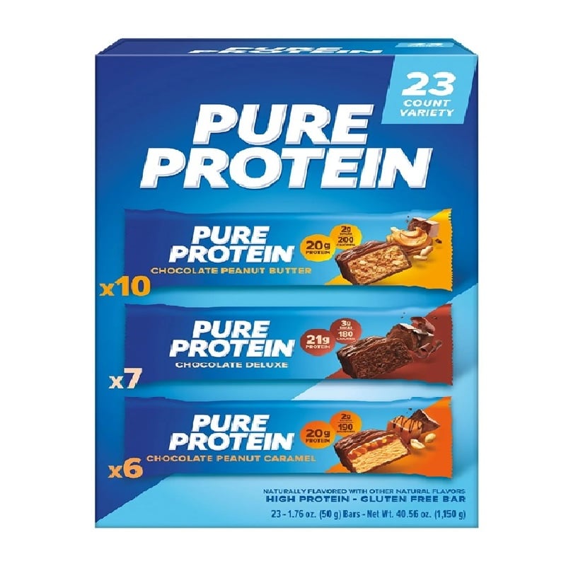 Incluye 23 Barras de Proteína Pura: Chocolate con Mantequilla de Cacahuete (10 unidades), Chocolate Deluxe (7 unidades), Chocolate con Caramelo de Cacahuete (6 unidades).