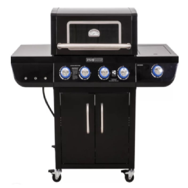 Asa con estilo con la parrilla a gas de 4 quemadores Even Embers con ventana de vidrio. Potencia hasta 42,000 BTU en cuatro quemadores principales de acero inoxidable. Con 589 pulgadas cuadradas de espacio de cocción total, esta parrilla te permite la versatilidad de cocinar para una multitud mientras controlas el progreso de tu parrilla con la ventana de visualización de vidrio de calidad para electrodomésticos. Accede a espacio de cocción adicional en el quemador lateral de acero inoxidable de 12,000 BTU, conveniente para preparar tus guarniciones favoritas. La campana resistente y aislada revestida de porcelana retiene el calor mientras cocinas en las rejillas de cocción de hierro fundido revestidas de porcelana de larga duración. La parrilla a gas de 4 quemadores Even Embers con ventana de vidrio cuenta con válvulas de combustible duales que te permiten convertir fácilmente de propano a gas natural (el kit de conversión se vende por separado). La parrilla a gas de 4 quemadores con ventana de vidrio brinda una experiencia de parrilla precisa en todo momento con nuestro medidor de temperatura incorporado y perillas y biseles de control azules modernos y precisos para un fácil control. Cuenta con cuatro ruedas giratorias con traba para facilitar la movilidad y ganchos para accesorios para mantener todas sus herramientas favoritas cerca. Disfrute de cocinar en su nueva parrilla a gas de 4 quemadores con ventana de vidrio Even Embers.
