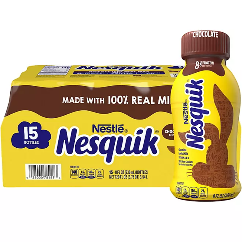 Los productos Nesquik listos para beber están elaborados con 100 % de leche real y contienen 8 gramos de proteína por cada porción de 236 ml (8 onzas líquidas)