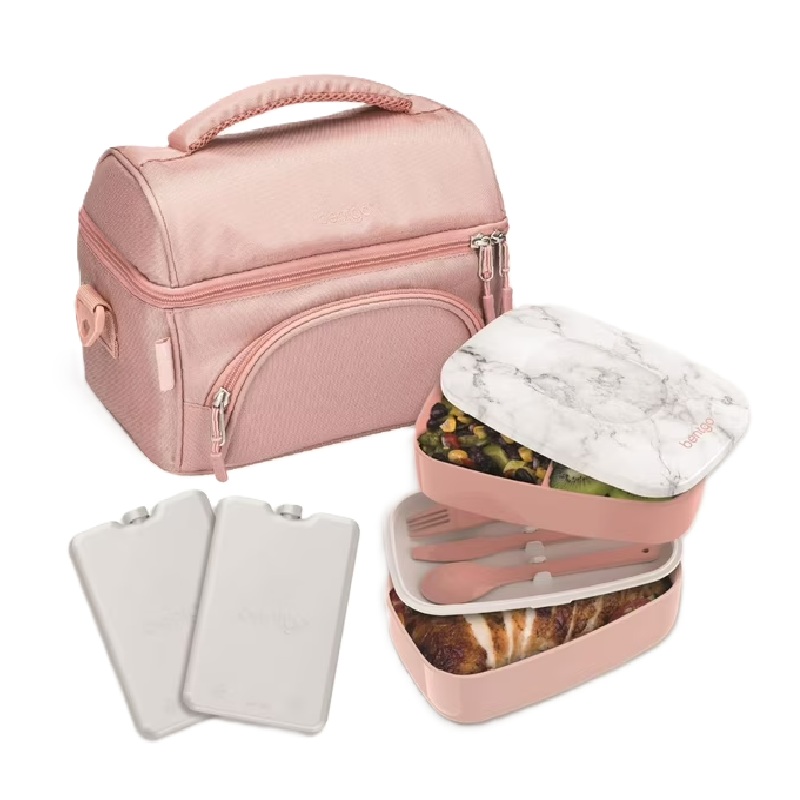 El set de almuerzo Bentgo Deluxe de 4 piezas facilita y agiliza el proceso de preparación de comidas. Este completo set incluye una lonchera térmica, una lonchera apilable con juego de utensilios integrado y dos bolsas de hielo, lo que te proporciona todo lo necesario para tus comidas fuera de casa.