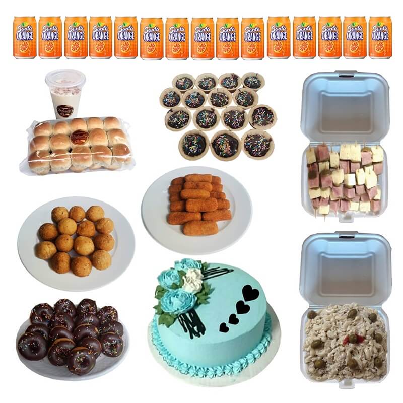- 1 Cake de 21 cm de diámetro, con panetela de vainilla con crema de chocolate cubierto con merengue saborizado (azul o rosado según preferencia). De no especificarse, se entrega el azul.