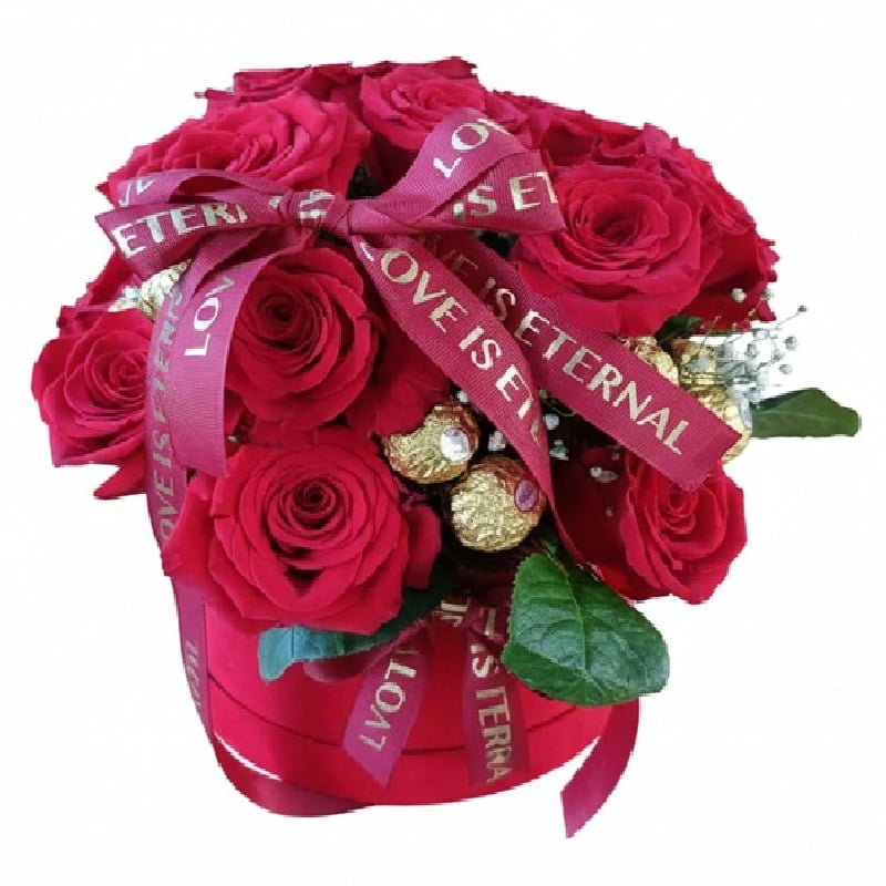 Un regalo de impacto que combina el lenguaje universal de las flores con la indulgencia del chocolate más emblemático. Esta espectacular caja cilíndrica roja contiene un arreglo exquisito: 16 rosas rojas frescas, complementadas elegantemente con 16 bombones Ferrero Rocher sueltos, presentados con su envoltorio individual.