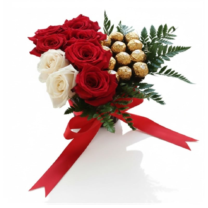 Un regalo que simboliza el amor en su expresión más dulce y romántica. Este corazón de rosas y chocolate presenta una caja corazón grande que despliega 10 hermosas rosas frescas junto a 11 exquisitos bombones Ferrero Rocher, creando un contraste perfecto entre la belleza natural y el lujo gourmet.