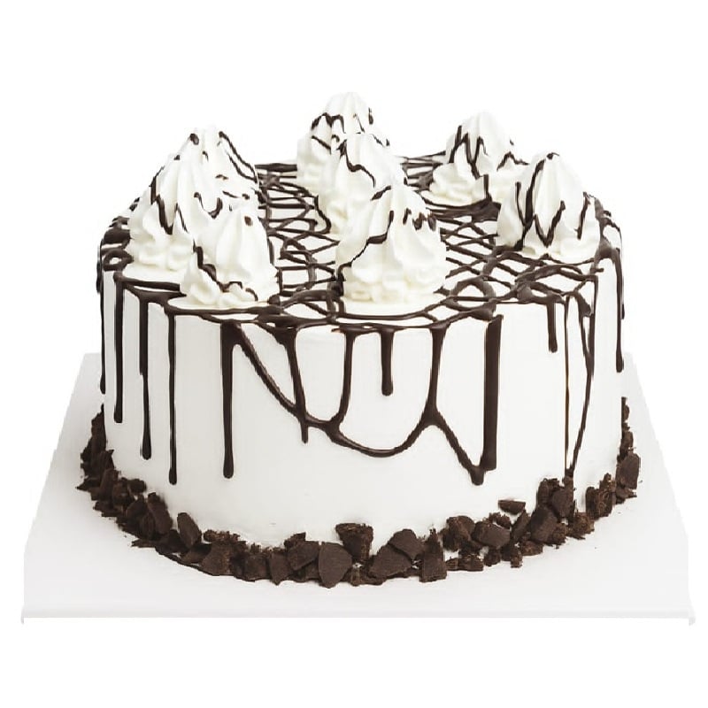 Cake con panetela de vainilla relleno con nata, cubierto con nata, decorado con hilos de chocolate y chips de chocolate.