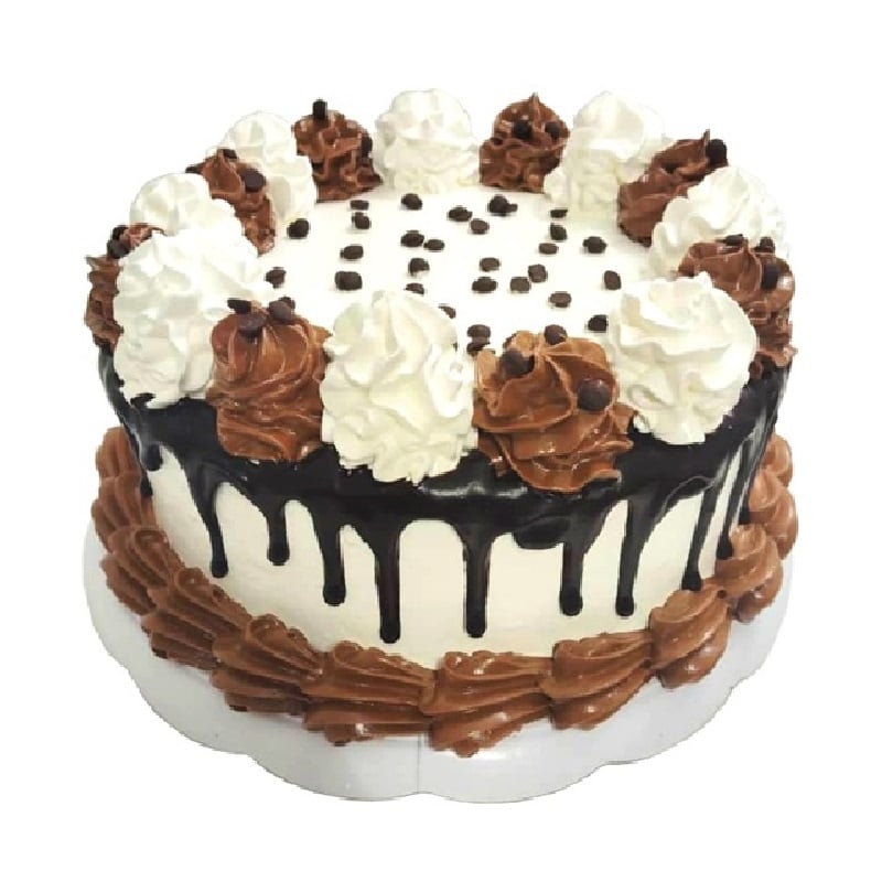 Panetela de vainilla relleno de crema de chocolate, cubierto con merengue saborizado, chispas de chocolate y cobertura de chocolate.