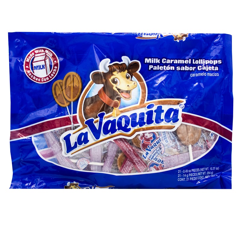 Paquete de Paletas de Caramelo Duro de Leche con sabor a cajeta, marca La Vaquita.