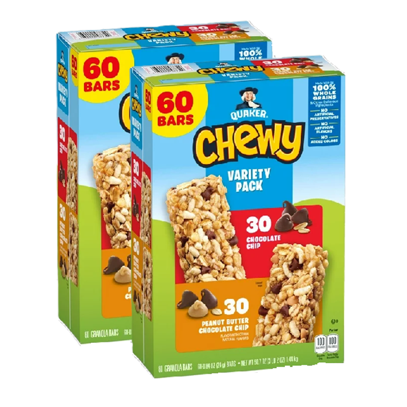 Incluye 60 barras de granola envueltas individualmente: 30 con chispas de chocolate y 30 con chispas de chocolate y mantequilla de cacahuete.