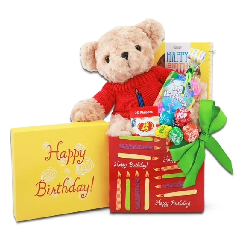 Sorprende a tus seres queridos con este encantador regalo de cumpleaños que incluye un adorable osito de peluche y dulces.