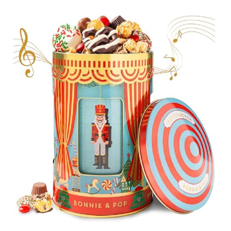 Esta adorable lata musical está llena hasta el borde con una deliciosa mezcla de aperitivos navideños. Incluye palomitas de maíz gourmet, pretzels cubiertos, mini oreos, bocados de chocolate y mucho más