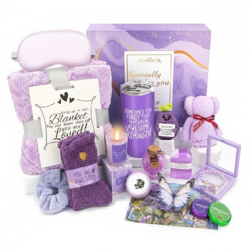 Juego de regalo de lujo de 16 piezas: cada juego incluye: 1 vaso aislado al vacío de 20 onzas, 1 vela perfumada de lavanda de 3.5 onzas, 1 bola de baño de lavanda, 1 jabón de baño hecho a mano de diamante, 1 sal de baño perfumada de lavanda, 1 tableta de ducha de limón, 1 toalla de oso de terciopelo coral, 1 pulsera de cuerda elástica de ágata morada, 1 máscara de ojos de seda, 1 Scrunchi. S,1*59 Manta de franela de 39 pulgadas, 1 calcetines peludos de felpa, 1 regalo de ganchillo hecho a mano, 1 tarjeta de regalo elegante, 1 exquisita caja de regalo
