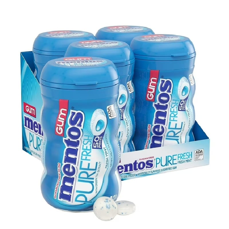 Incluye cuatro botellas de 50 unidades de chicles Mentos Pure Fresh Mint sin azúcar.