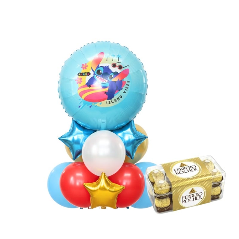 ¡Sorprende con un regalo que combina magia, decoración y lujo! Este combo especial incluye un bouquet de globos temático de Lilo & Stitch para crear un ambiente festivo inolvidable, acompañado de una caja de 16 Bombones Ferrero Rocher para añadir un toque de elegancia y dulzura. Perfecto para cumpleaños, aniversarios o cualquier ocasión que merezca una celebración única y muy especial.