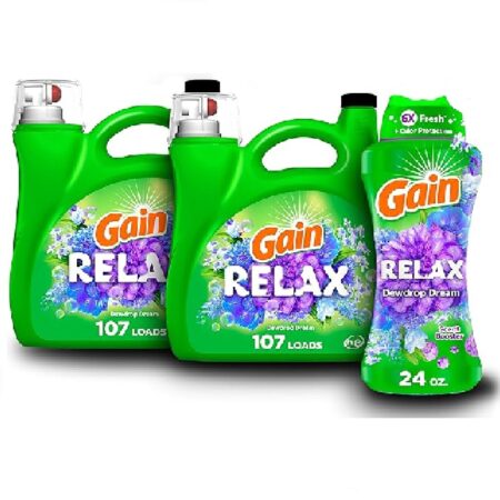 Detergente líquido para ropa, Relax, compatible con HE, 154 onzas líquidas, 107 cargas + Gain In-Wash – Perlas potenciadoras de aroma para lavandería, aroma relajante, 24 onzas