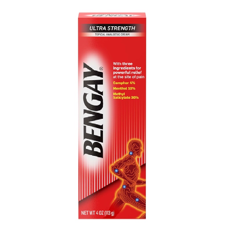 Tubo de 4 onzas de crema para aliviar el dolor tópico Bengay Ultra Strength no graso con tres potentes ingredientes para aliviar dolores de espalda, artritis menor, dolor muscular y articular.