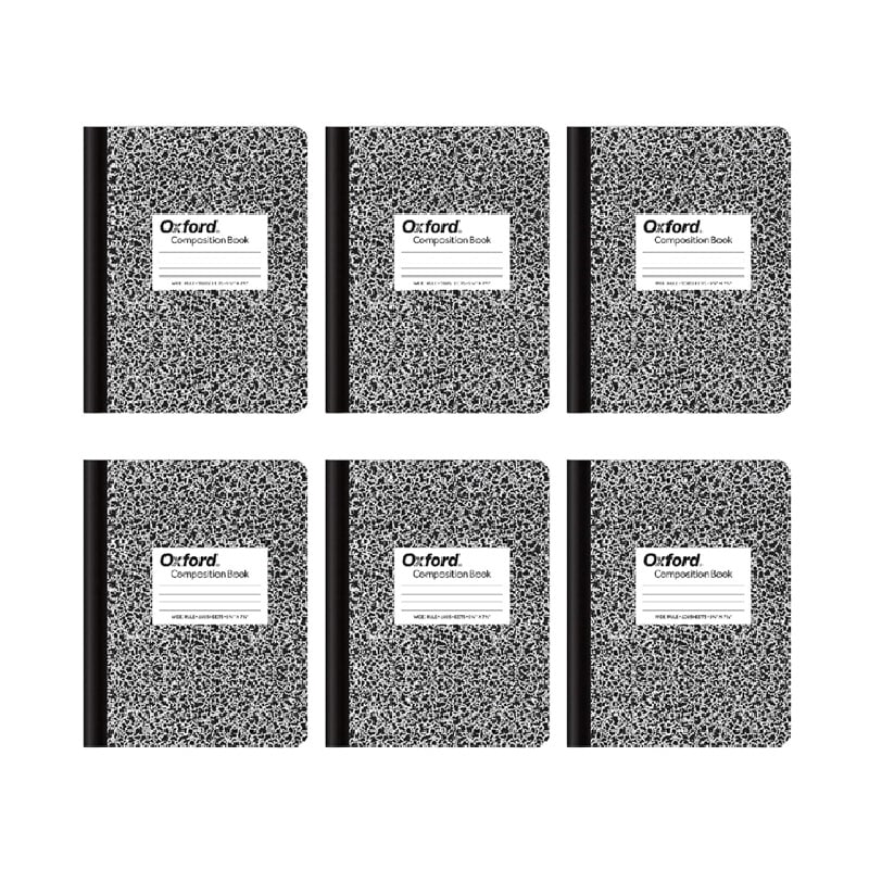 Oxford Los libros de composición son el diario, cuaderno o diario perfecto para la escuela, el hogar o el trabajo; rayas anchas; 7-1/2 x 9-3/4 pulgadas; 100 hojas; mármol negro; paquete de 6. La encuadernación segura cosida en el centro mantiene las páginas intactas; lo convierte en un diario encuadernado permanentemente.