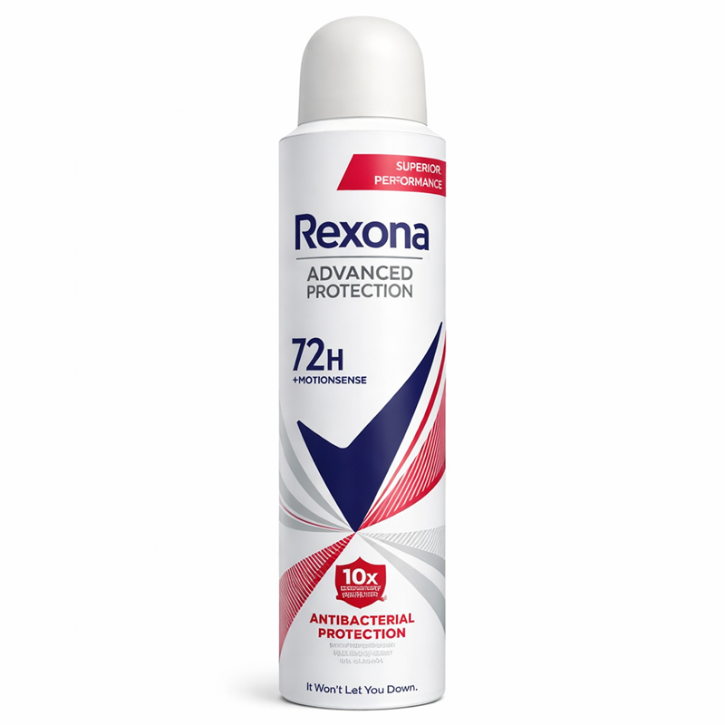 Desodorante Rexona Antibacterial 72 h ofrece protección instantánea en aerosol con tecnología Motionsense™.
