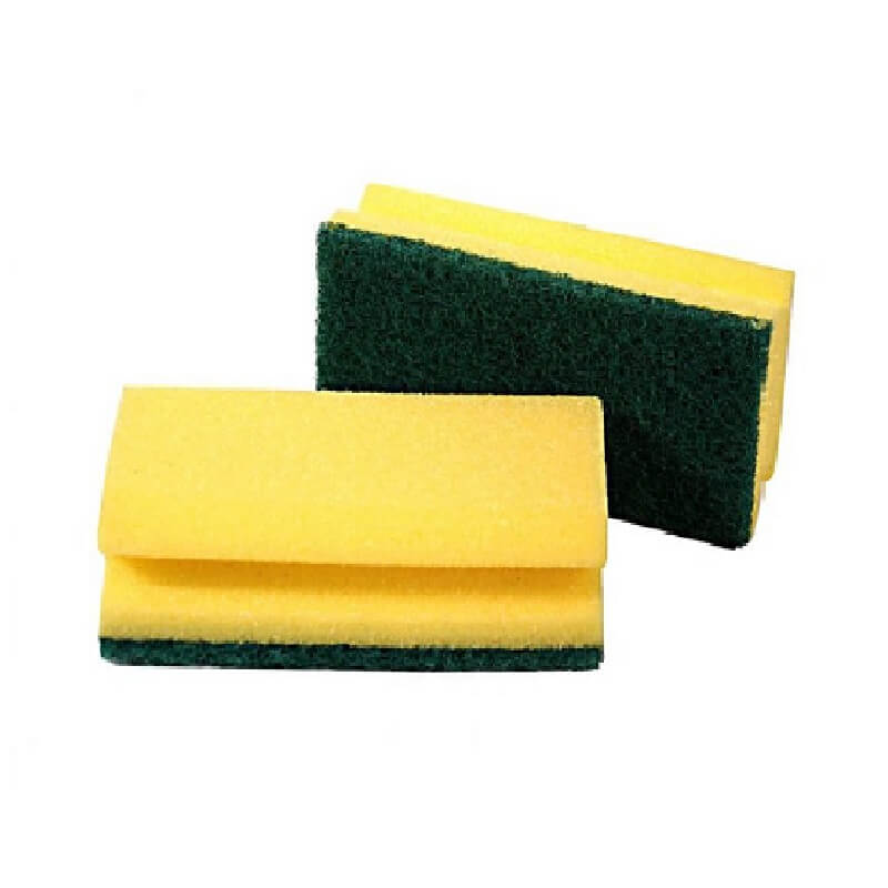 Esponjas para fregar con doble superficie (una de fibra verde para los residuos o salsas y horneados pegajosos y otra para un lavado más suave). Forma perfecta y adaptable a las manos.