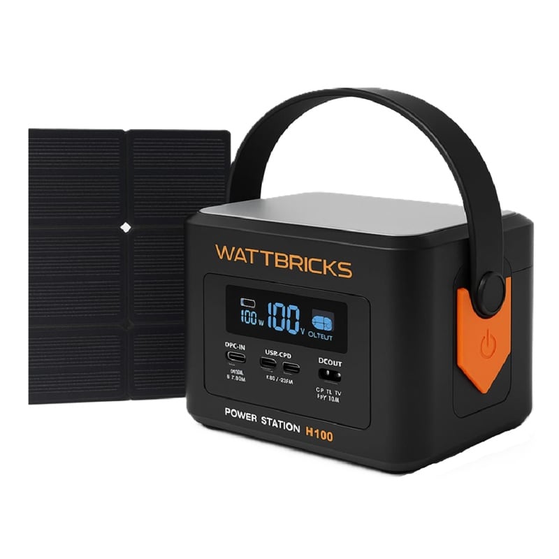 Paquete de estación de energía portátil Wattbricks Energy de 100 vatios de potencia máxima y panel solar portátil de 30 vatios
