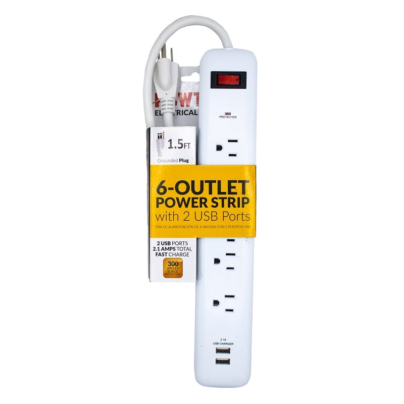 Extensión Eléctrica con protección de sobre voltaje con descarga a tierra de 6 salidas y 2 USB.