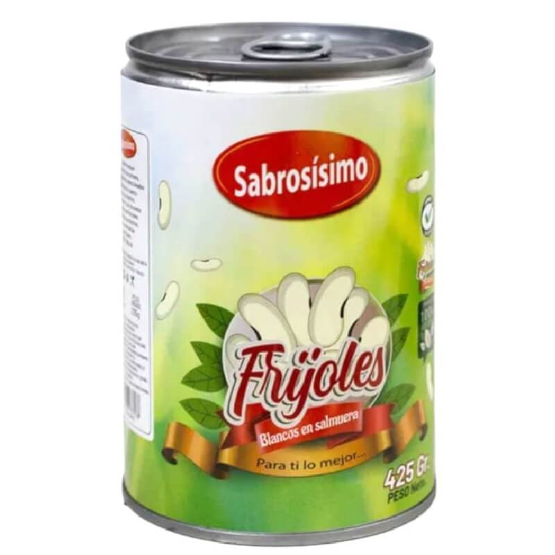 Frijoles blancos en salmuera, marca Sabrosísimo. Son frijoles horneados perfectos para guisos, sopas o simplemente calentados con especias para un delicioso snack. Vienen precocinados y sazonados, lo que ahorra tiempo en la cocina.