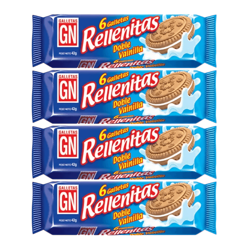 4 Paquetes de Galletas sabor egun disponibilidad (fresa, vainilla, chocolate) marca Rellenitas.