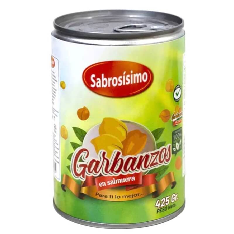 Garbanzos en salmuera, marca Sabrosísimo. Son garbanzos precocinados ideales para ensaladas, guisos o como un snack saludable. Al estar en salmuera, están listos para consumir, ahorrando tiempo en la preparación de comidas.