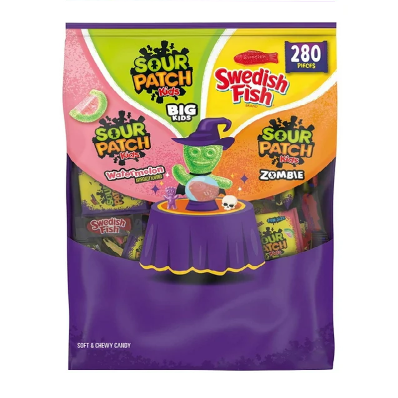 Bolsa grande con muchas piezas, variedad de gomitas, envoltorios festivos de Halloween.