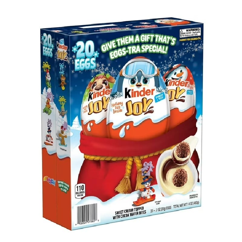 Incluye 20 huevos de chocolate navideños Kinder Joy con crema dulce, bocaditos de oblea de cacao y juguete sorpresa.