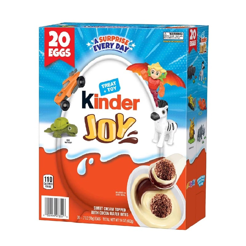 Incluye 20 huevos sorpresa Kinder Joy Everyday de chocolate blanco.