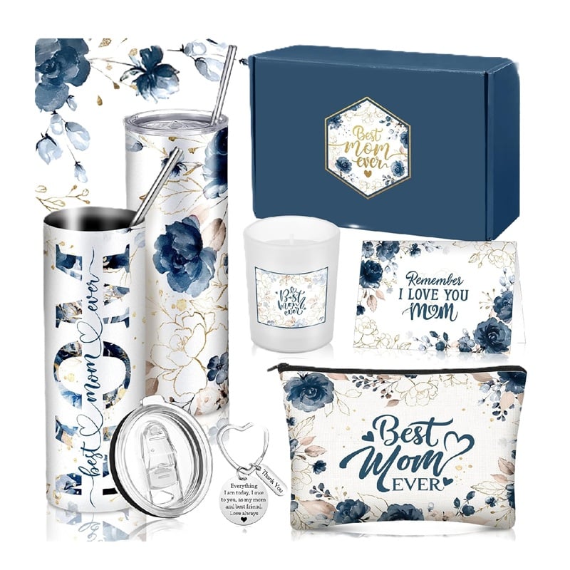 Este juego de regalo floral de tinta azul oscuro para madre incluye un vaso de acero inoxidable, una bolsa de cosméticos, tarjeta de felicitación, llavero, vela perfumada y una caja de regalo.