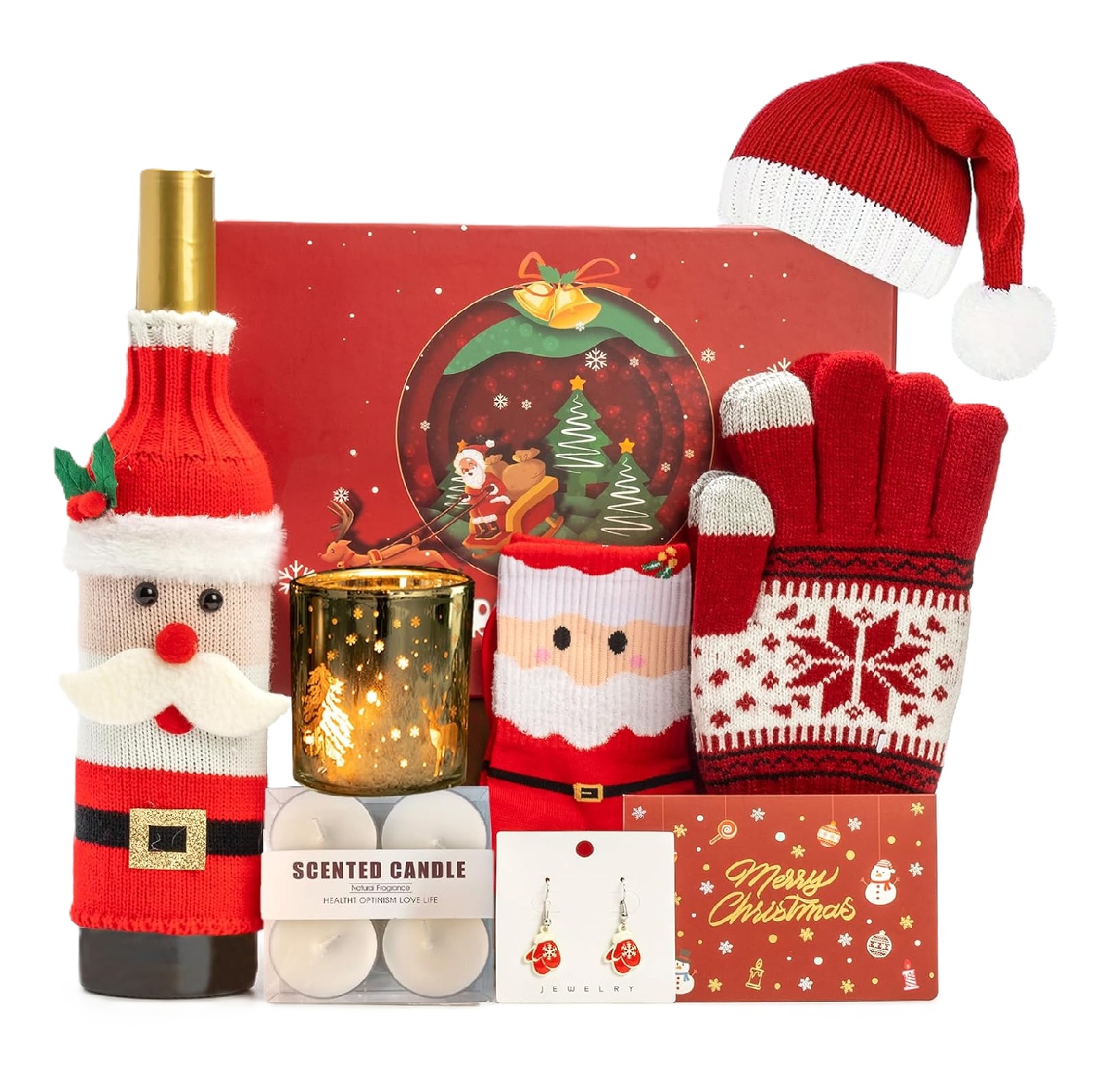 Caja de regalo de Navidad cuidadosamente diseñada que incluye 9 artículos prácticos y reflexivos: 1 funda para botella de vino de Navidad, 1 par de aretes, 1 guantes de pantalla táctil de copo de nieve, 1 par de calcetines de Navidad, 4 velas de té, 1 portavelas de Navidad, 1 sombrero de Navidad, 1 tarjeta de felicitación de Navidad y 1 exquisita caja de regalo.