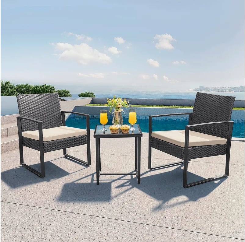 • El conjunto de bistró para exteriores incluye una elegante mesa auxiliar con tapa de vidrio, perfecta para un par de copas de vino o el café de la mañana y el periódico. Su característica de resistencia a la intemperie le permite limpiarlo rápidamente.