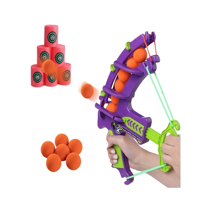 El paquete viene con un juego completo que incluye 6 blancos de tiro rojos, 6 bolas de espuma suave naranja y un arco de tiro morado.