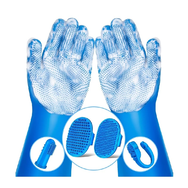 Suministros prémium para mascota. Nuestro kit de aseo para mascotas de 6 piezas incluye 2 guantes de aseo para mascotas, 2 cepillos de lavado de perros y 2 cepillos de dientes para dedos de perro para satisfacer todas las necesidades de cuidado de tus mascotas: baño, aseo, depilación, masaje y cuidado bucal.