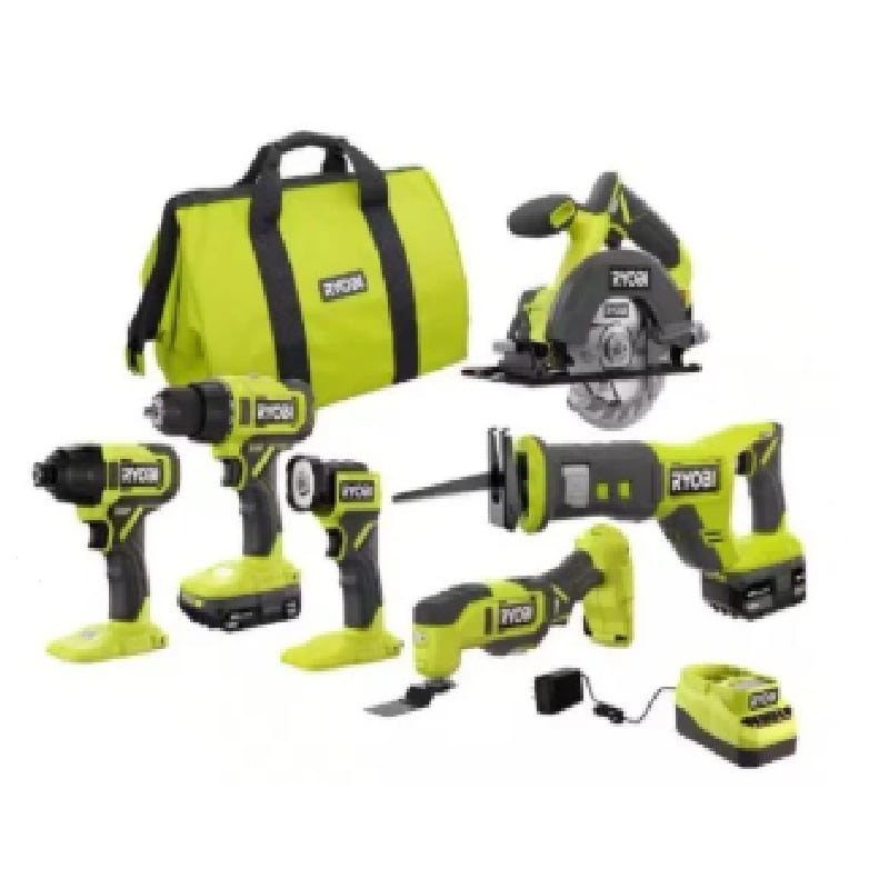 RYOBI presenta el kit combinado de 6 herramientas ONE+ de 18 V con taladro/atornillador de 1/2 pulg., atornillador de impacto de 1/4 pulg., sierra recíproca, sierra circular de 5-1/2 pulg., multiherramienta, luz LED, baterías, cargador y bolsa. El taladro/atornillador proporciona hasta 515 pulg./lb. de torque e incluye un mandril metálico de trinquete de 1/2 pulg. para satisfacer sus necesidades de taladrado y atornillado. El atornillador de impacto puede colocar tornillos largos para terrazas o tirafondos grandes con facilidad, entregando 3400 pulg./min (IPM) junto con 1800 pulg./lb. de torque controlado por un gatillo de velocidad variable que genera 2700 RPM. La sierra recíproca ofrece mayor productividad con hasta 3400 SPM y un corte un 60 % más rápido. La sierra circular de 5-1/2 pulg. tiene la capacidad de cortar material de 2 por 2, con más de 215 cortes por carga. La multiherramienta cuenta con un dial de velocidad ajustable que permite realizar cortes en paneles de yeso, metal, madera, plástico, materiales compuestos y otros, además de lijar hasta los detalles más finos. La luz LED también ofrece una potencia luminosa de 280 lúmenes y un cabezal pivotante de 130°. Las baterías y el cargador incluidos son compatibles con las herramientas RYOBI ONE+. Lo mejor de todo es que este kit forma parte del sistema RYOBI ONE+, compuesto por más de 300 productos inalámbricos que funcionan con la misma batería. Con la garantía del fabricante de 3 años de RYOBI, este kit incluye un taladro/atornillador, un atornillador de impacto, una sierra circular, una sierra alternativa, una multiherramienta, una luz LED, una batería de 4.0 Ah, una batería de 1.5 Ah, un cargador, una bolsa y manuales del usuario.