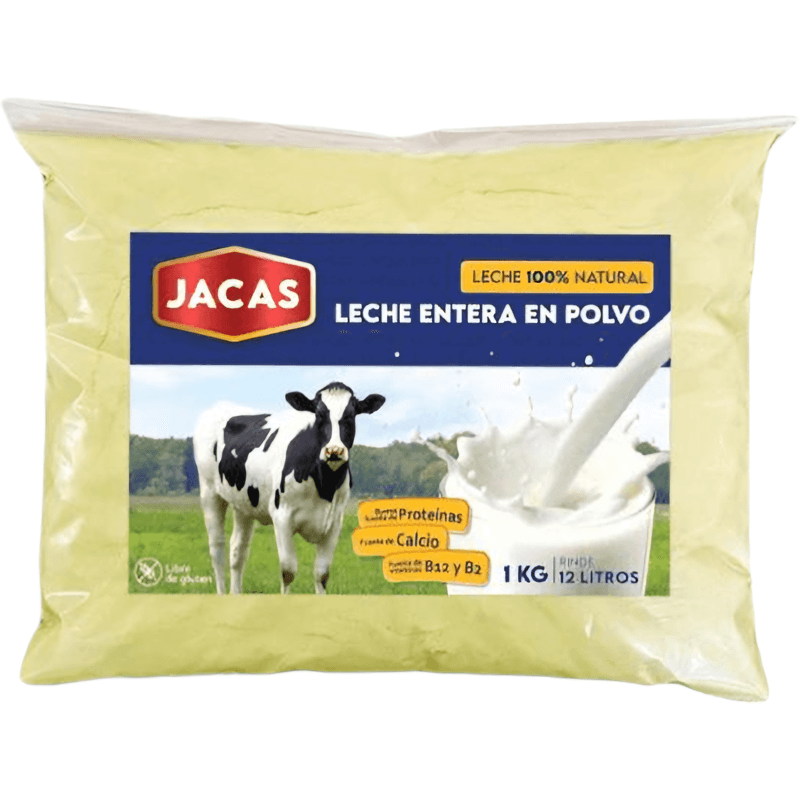 Paquete de 1 Kg de leche entera en polvo, marca Jacas.