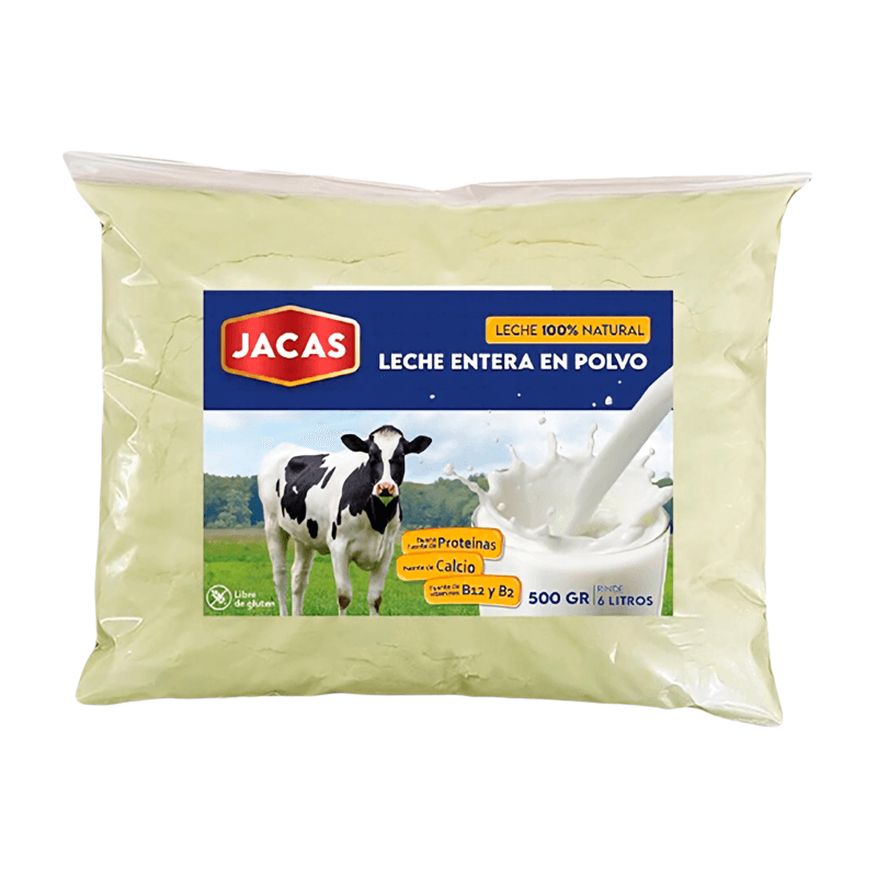 Paquete de 500 g de leche entera en polvo, marca Jacas.
