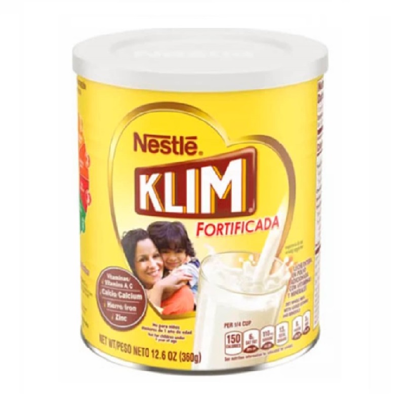 Leche entera en polvo Klim, fortificada con vitaminas A y C, calcio, hierro y zinc. No apta para niños menores de 1 año.