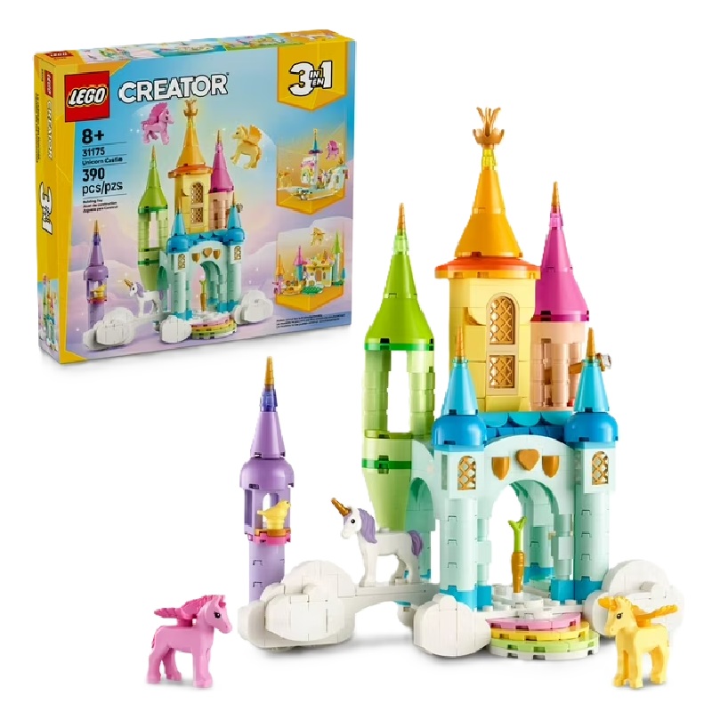 El set de construcción LEGO Creator 3 en 1 Castillo Unicornio permite a niños de 8 años en adelante crear 3 escenarios mágicos diferentes con los mismos ladrillos: un castillo de unicornio, un barco de unicornio o un parque de juegos de unicornio.