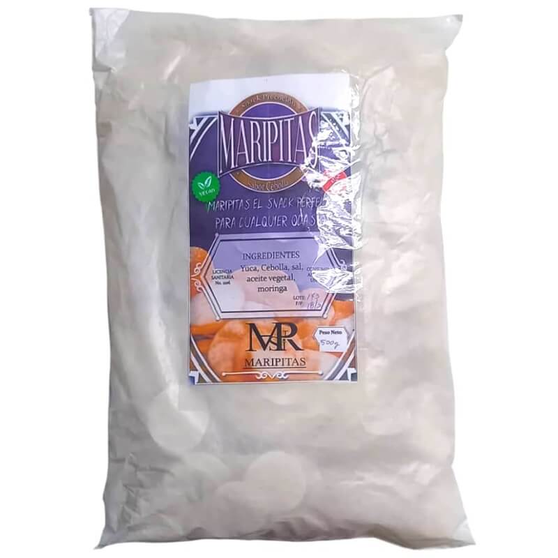 Maripitas de Yuca Sabor Cebolla, marca Andrea´s. Producto similar a los chicharrones de viento, se fríen en aceite caliente y se hinchan.