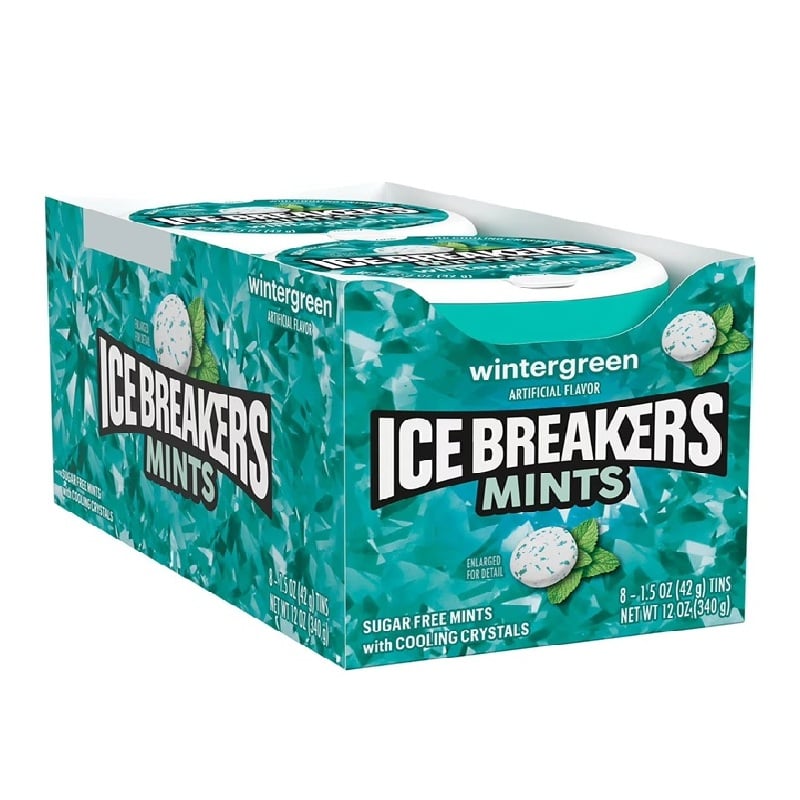 Contiene una (8) latas de 1.5 onzas de mentas para el aliento sin azúcar ICE BREAKERS Wintergreen
