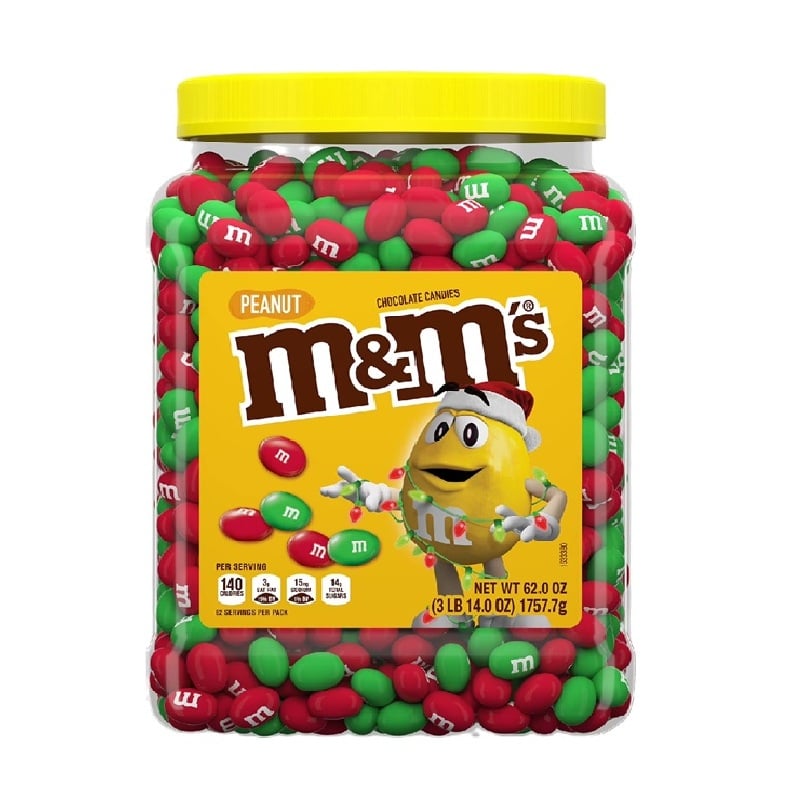 Contiene un (1) frasco resellable de 62 onzas de dulces navideños surtidos de M&M’S con chocolate con leche y cacahuete rojo y verde.