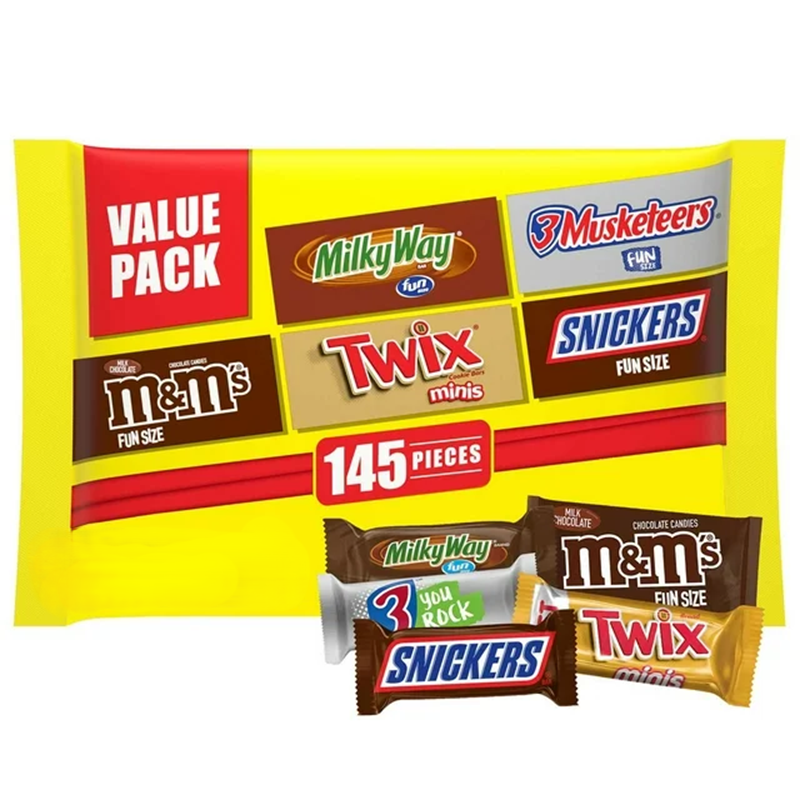 Contiene una (1) bolsa de dulces a granel de 71.8 onzas con 145 piezas de M&M’S, Twix, Snickers y más.