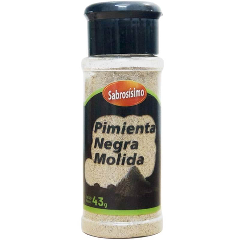 Pimienta Negra Molida marca Sabrosísimo. Es una especia clásica con un sabor picante y cálido. Ideal para condimentar carnes, verduras, salsas, sopas, entre otros. Especia muy demandada en la gastronomía por el olor y sabor que le aporta a cada plato.