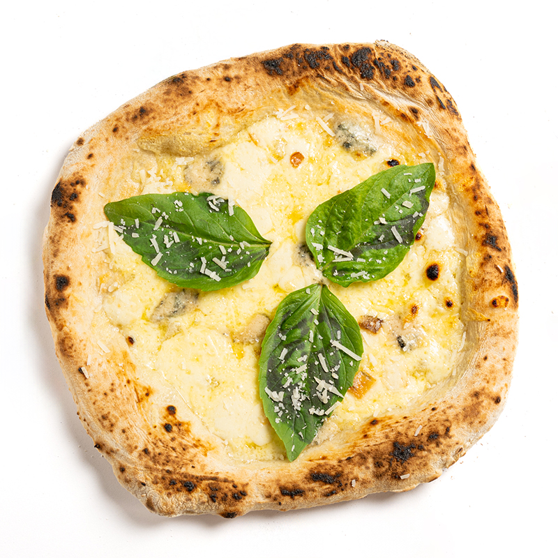 Mezcla cremosa de queso azul, parmesano, provolone y gouda. Una pizza rica, intensa y envolvente, perfecta para amantes del queso que buscan un sabor profundo.
