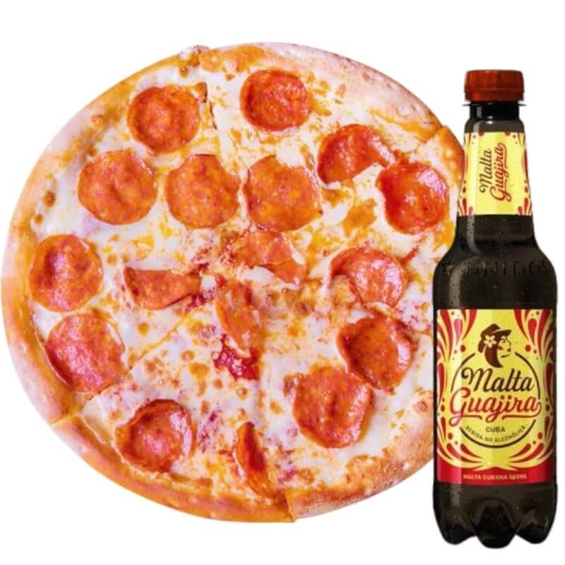 Pizza Aaron que contiene queso blanco-salami, más un líquido (Malta Guajira).