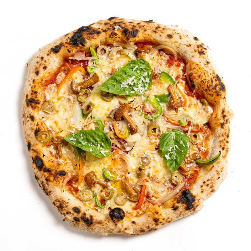 Esta maravilla fitness trae salsa de tomate natural, lonjas de cebolla, pimiento, aceitunas verdes, champiñones y un recubrimiento de queso parmesano y basílico fresco.
