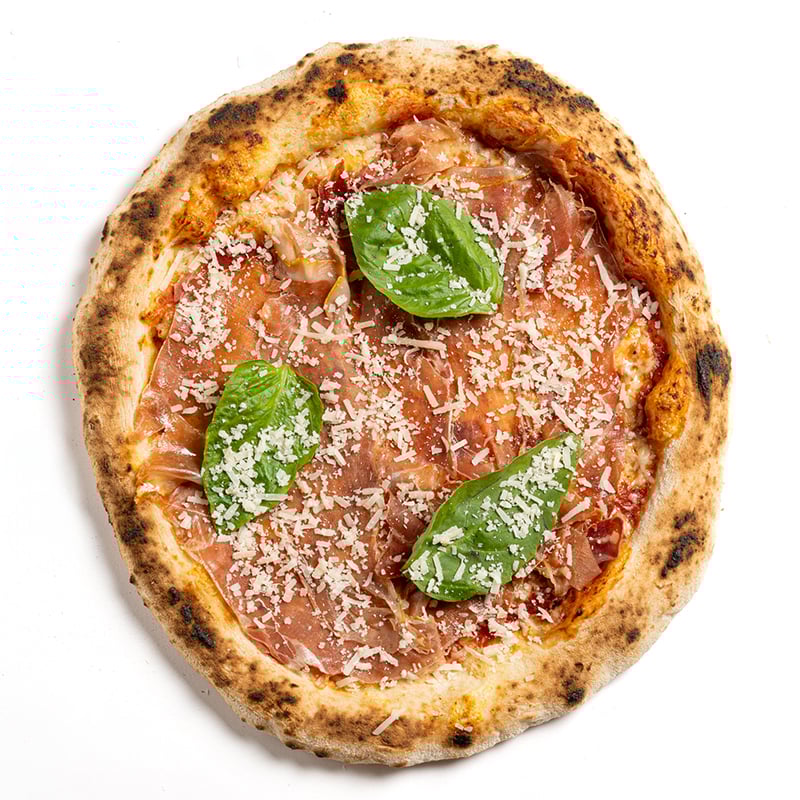 Tomate suave, queso, basílico fresco y finas lonchas de jamón serrano añadidas tras el horneado. Un bocado elegante, con aroma intenso y el contraste ideal entre calor y frescura.